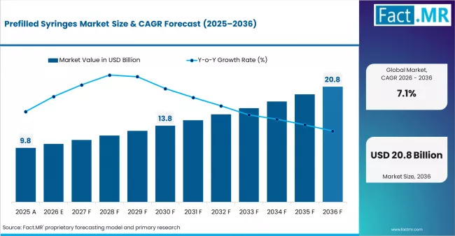ROCKVILLE, MD, UNITED STATES, April 8, 2026 /EINPresswire.com/ — The global Prefilled Syringes (PFS) market is undergoing a structural evolution, transitioning from a specialized packaging format to an essential cornerstone of the injectable drug delivery ecosystem. Valued at USD 9.8 billion in 2025, the market is projected to grow to USD 10.5 billion in 2026, eventually reaching USD 20.8 billion by 2036, according to the latest analysis by Fact.MR.